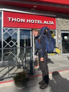 I Alta slo vi til med hotellovernatting, og dagen åpnet med utsøkt frokost. Her fantes mer enn vi kunne drømme om, inkludert Litago på tapp. Etter et par-tre timer trakk vi opp igjen på rommet og fordelte turens siste depot. Med smekkfulle sekker startet vi på etappe 16. Noen få kilometer av gårde traff vi en mann og slo av en prat. Mannen spurte hvor vi hadde begynt, vi svarte Lindesnes, og mannen spurte om vi hadde brukt 20 eller 30 dager derfra. Vi er selvsagt enige i at vi egentlig burde snittet på et sted mellom 90 og 135 km om dagen.