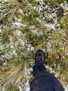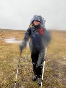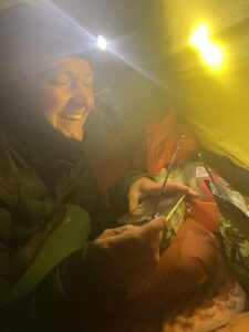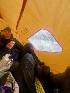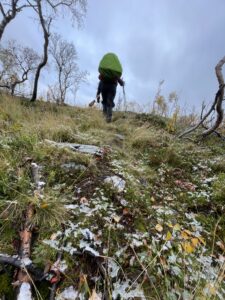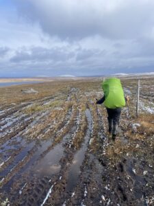 Det snudde til massivt regn, storm i kastene og effektiv temperatur godt under null. Stien ble stadig mer utvisket, og lenge tråkket vi utelukkende i myr og gjørme. Vi frøs og gikk kontinuerlig da det var uforsvarlig å ta pause. Vi var enige om at det beste alternativet var å gå, og at det nest beste var å trykke på SOS-knappen. For første gang på turen var været og underlaget så dårlig at vi hadde vi lyst til å gråte. Vi kom oss ut av det verste terrenget, og øynet et sted vi kunne slå leir. For å bedre motorikken, tok vi harehopp før vi satte opp teltet. Så gjorde Karoline en helteinnsats med å hente vann, og vi trakk inn og lagde mat. Etter hvert fikk vi varmen, og Karoline bemerket at hun ikke hadde tatt av buffen på fire dager.