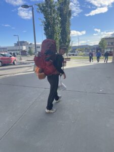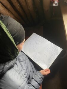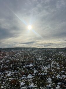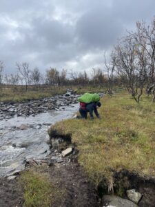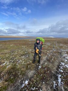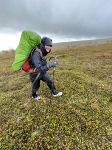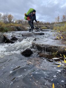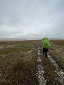 Vi gikk et par mil østover fra Alta. Omtrent samtidig som vi fant teltplass, fant en sønn bankkortet til Karoline. Ikke visste vi at det var borte, men begeistringen var stor likevel. Dagen etter fortsatte vi i mer nordlig retning, dels på sti og dels fritt i terrenget. Det blåste, sluddet og haglet om hverandre, og vi var kalde, våte og slitne da vi satte opp teltene. Neste dag fortsatte myr og kratt å dominere, og hetten dyttet luen ned i øynene. Vi hadde nylig sett på 71 grader nord, og jeg sa til Karoline at jeg følte meg som Ingrid Gjessing Linhave. Det var i hvert henne jeg siktet til, da jeg sa jeg følte meg som Ingrid Espelid Hovig.