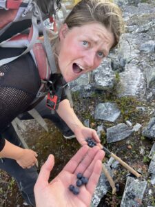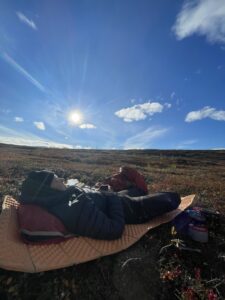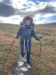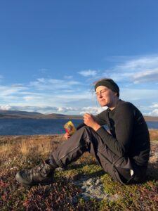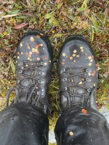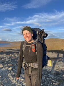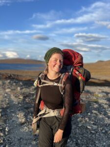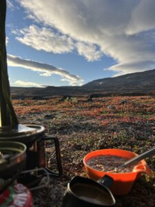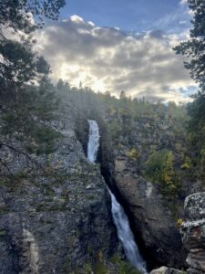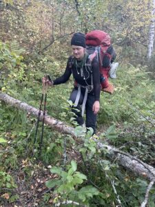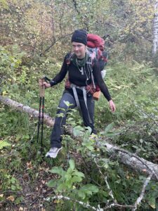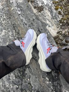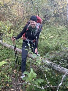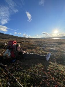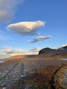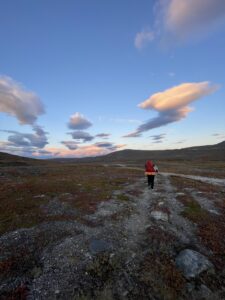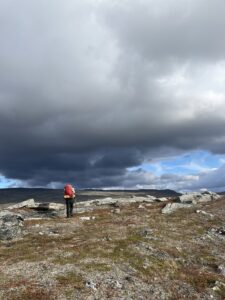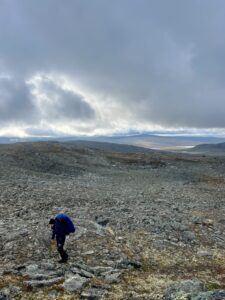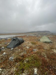 Fra Helligskogen fulgte vi asfalten et stykke, til vi traff på stien som gikk nordøstover. Karoline fikk testet sine nye joggesko, som holdt pastellfargen i tre myrer og ett kvarter. I usjarmerende vær gikk vi til Loassuhytta. Her satte vi opp teltene rett utenfor, ettersom døren var låst. Det regnet massivt og blåste så friskt at Karoline foreslo å legge steiner over teltpluggene. Uten dette ville pluggene trolig snart blitt revet opp, og jeg roste initiativet opp i skyene. Eventuelt bort eller ned i skyene, de var overalt. Neste morgen fulgte vi stien så langt den rakk, og navigerte deretter fritt. Våt ur dominerte landskapet i flere dager, og nestenulykkene kom på rekke. Heldigvis har kroppene fått ninjareflekser etter fire måneder på tur, og vi kom fra det med skinnet og knoklene i behold.