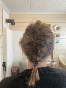Før vi gikk videre fra Helligskogen fjellstue, holdt Karoline flettekurs på bestilling. Dette da jeg foreløpig verken har tatt permanent eller anlagt dreads, selv om det ville vært fordelaktig. I motsetning til Karoline, har jeg aldri kunnet flette mitt eget hår, men har likevel prøvd ved et par anledninger. Et helhjertet forsøk er presentert under. Vi rigget til for undervisning, og Karoline instruerte. Jeg flettet innbitt, men armene kollapset av morbide laktatverdier og håret rant ut av hendene. Jeg rakk å annonsere min avgang som fletteaspirant, men kursholderen var stoisk. Hun motiverte så snilt og ga så pedagogiske huskeregler at jeg valgte å gjøre comeback, og like etter løsnet det. For første gang i livet kunne jeg lage pariserflette selv, fantastisk. Tusen takk, Karoline! Nå synes jeg det er så gøy og stas å flette at jeg alltid gleder meg til håret må flettes på nytt. Litt som den sommeren jeg lærte å legge kabal, og i sengen på kvelden ikke kunne vente til det ble morgen. Så jeg kunne stå opp og legge kabal.