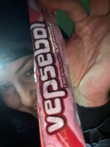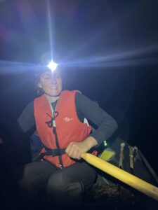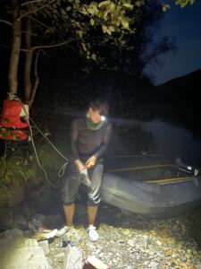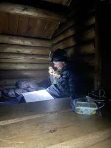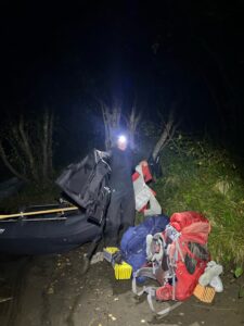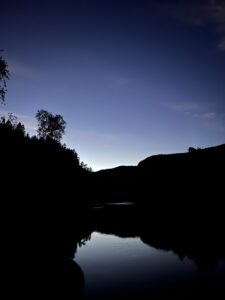 Vi tråkket et lite stykke på grusvei før en ny sti ventet. Denne slynget seg gjennom nydelig blåbærskog, var svært lettgått og forbilledlig merket. Etter hvert falt mørket på, og vi gikk videre med hodelykt. Vi fant ingen teltplasser i skogen, og bestemte oss dermed for å overnatte i Seimahytta. Denne ligger på motsatt side av elven, og kan nås med båt fortøyd ved bredden. Veldig flott tilbud! På maks lysstyrke kunne vi skimte vinduene i Seimahytta, og landet på å forsøke elvekryssing. Karoline klargjorde båten og jeg satte meg til for å ro. Vi kom ikke langt utpå før strømmen i Reisaelva ble merkbar. Båten drev som en badeand, og jeg slet med å motvirke kreftene. Fremdriften ville utvilsomt vært bedre med kvassere teknikk, men som en hederskvinne omtalte jeg heller åregaflene i negative ordelag. Omsider nådde vi ønsket destinasjon, trakk opp båten, beundret stjernehimmelen og seig inn i Seimahytta.
