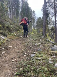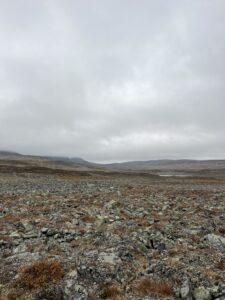 Strekningen fra Seimahytta mot Alta er delvis stiløs. Vi tegnet opp en ganske rett linje på kartet, og den tok oss opp i 800-900 meters høyde. Så langt nord er det ensbetydende med stein. Ur setter virkelig evnen til holde på humøret på prøve. Eline består litt oftere enn meg. På den positive siden er det få ting som bygger fellesskap som en felles fiende, og vårt lille kollegium har blitt svært tett sammenvevd. At det snart kommer en tid for å slakke litt på trådene oss i mellom føles merkelig.